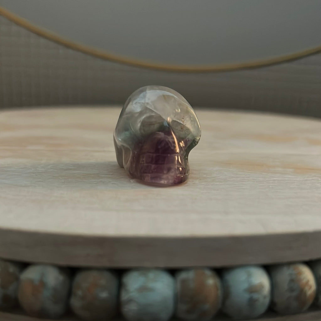 This mini skull is a beautiful specimen of fluorite with a mix of clear and teal and purple with some beautiful striations. Fluorite is a stone of psychic development, abundance, and creative openings.