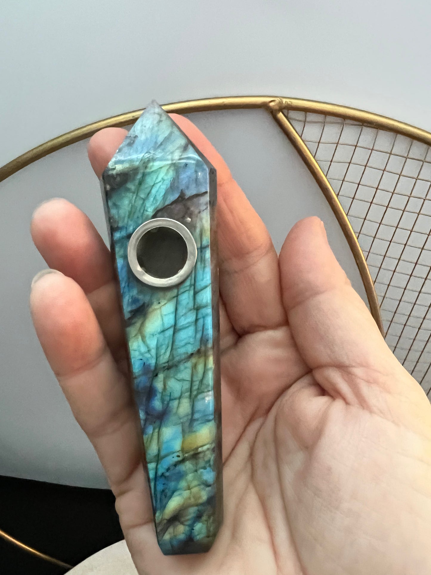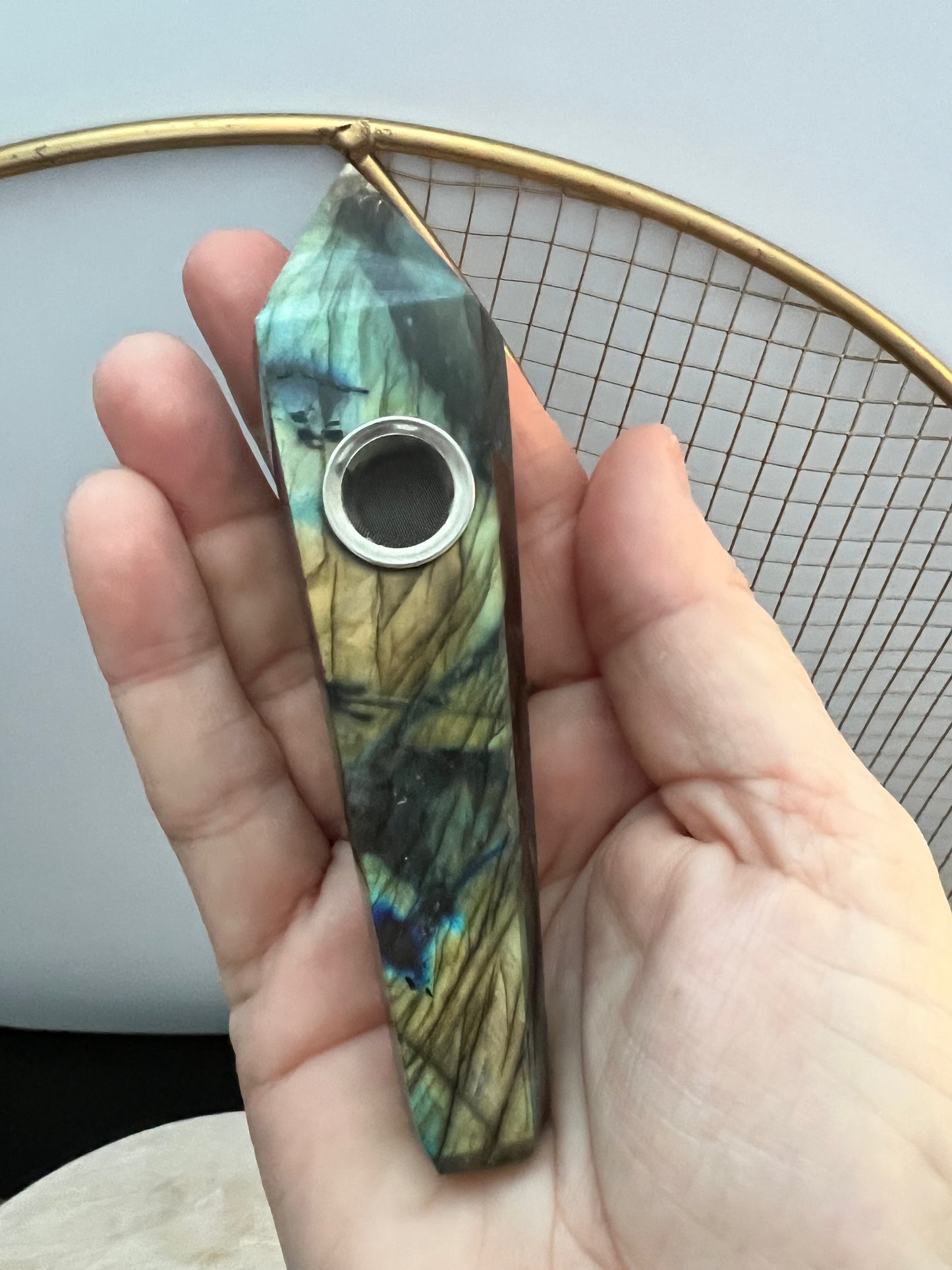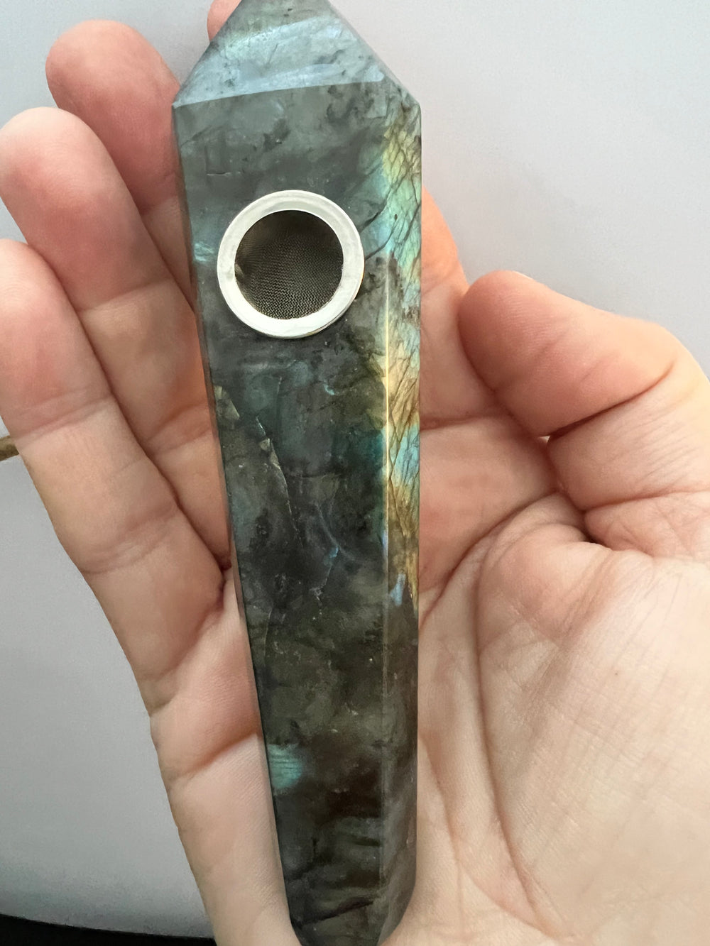 A Beautiful Labradorite Pipe used for your choice of herbal blends. Labradorite is an energetically potent stone that infuses your entire system with light. Its strong metaphysical properties for transformation assist you to recognize your purpose for being here as it illuminates your true self. This stone is a wonderful connector to the cosmic energies
