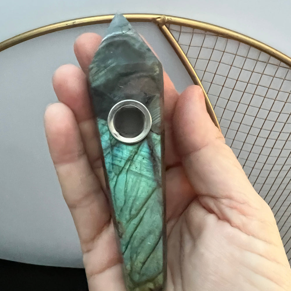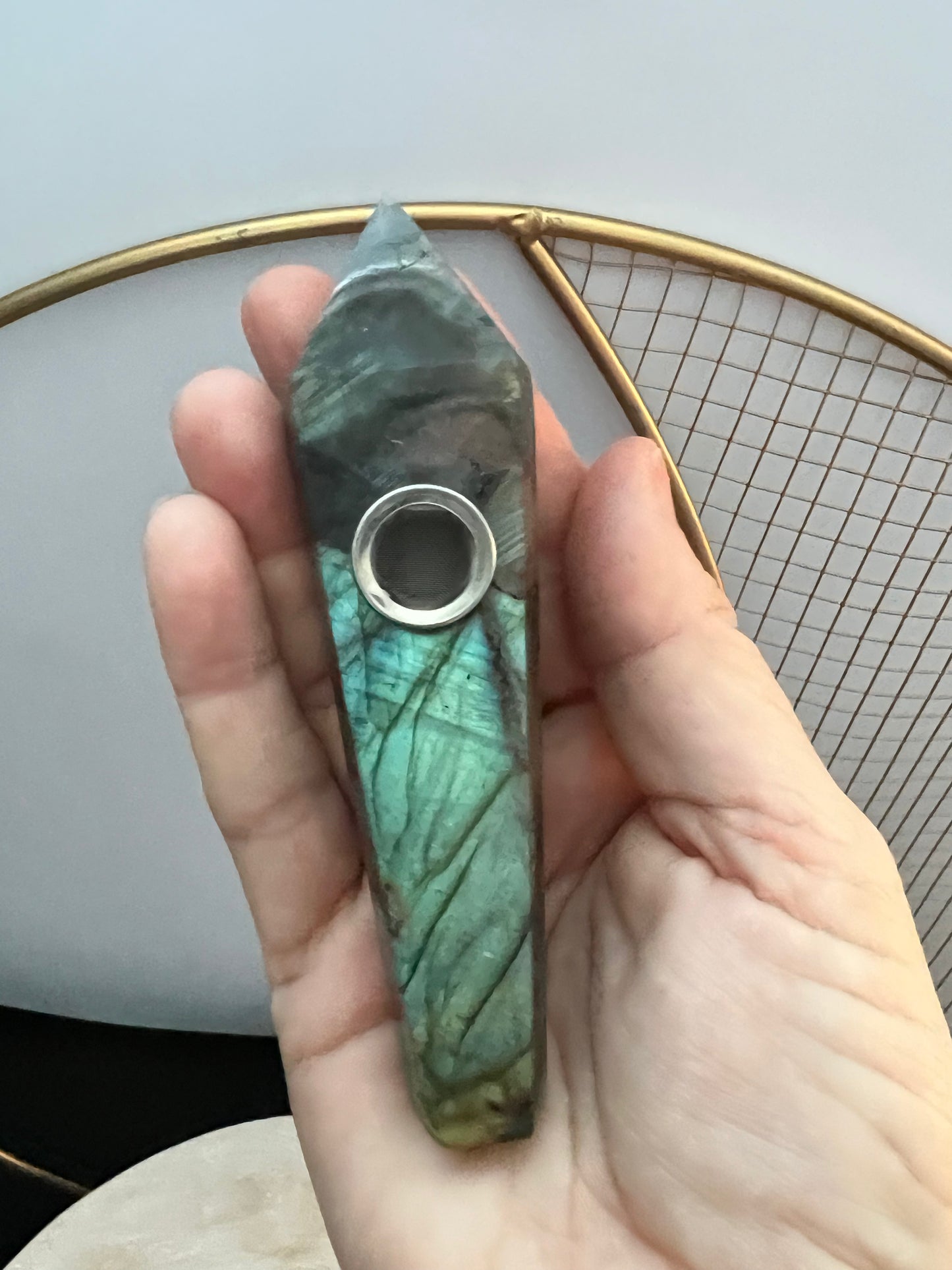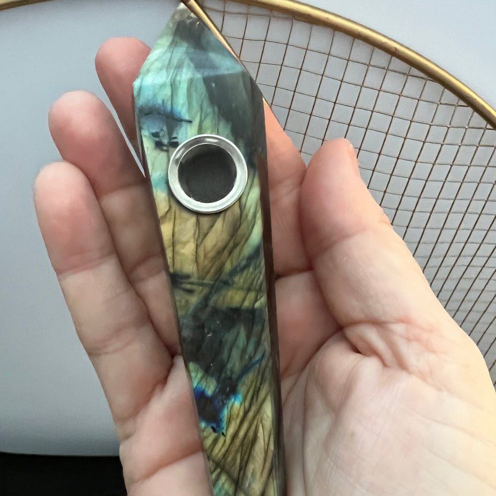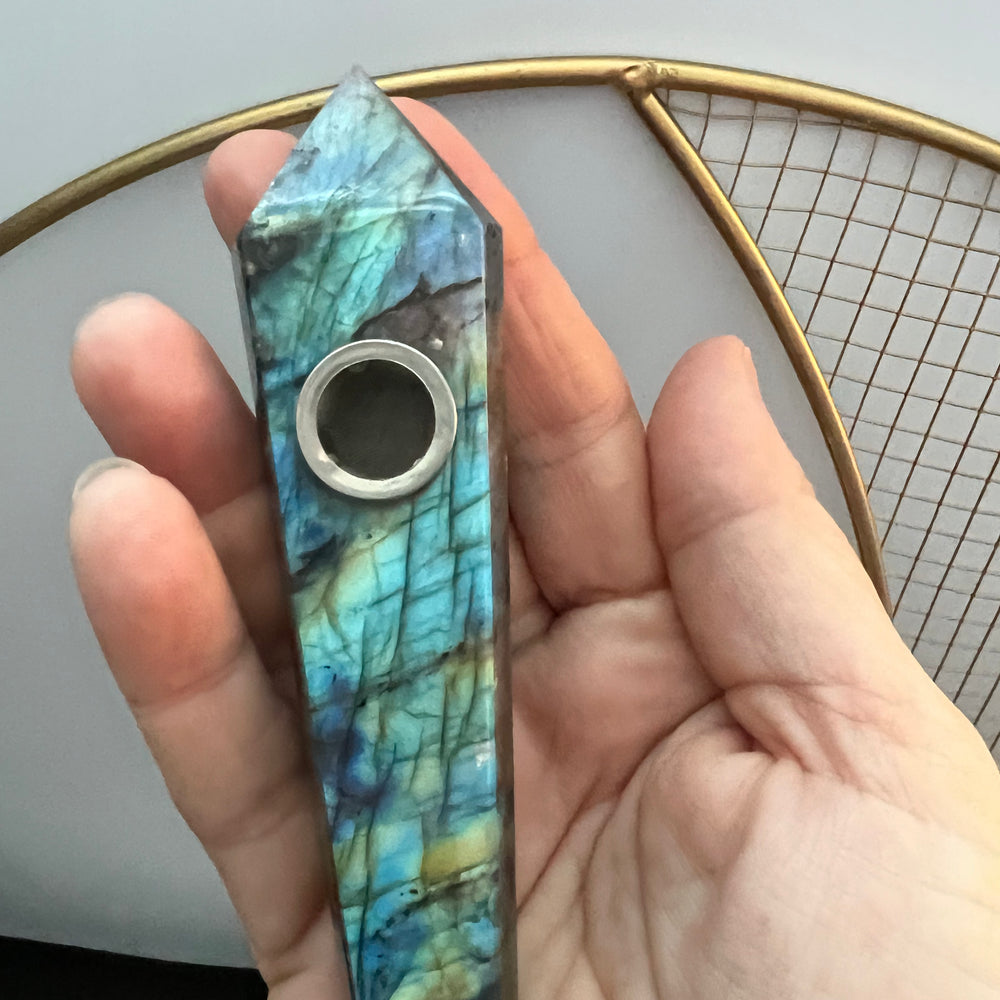 A Beautiful Labradorite Pipe used for your choice of herbal blends. Labradorite is an energetically potent stone that infuses your entire system with light. Its strong metaphysical properties for transformation assist you to recognize your purpose for being here as it illuminates your true self. This stone is a wonderful connector to the cosmic energies