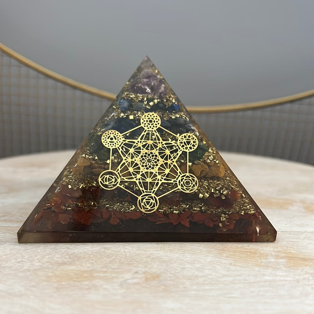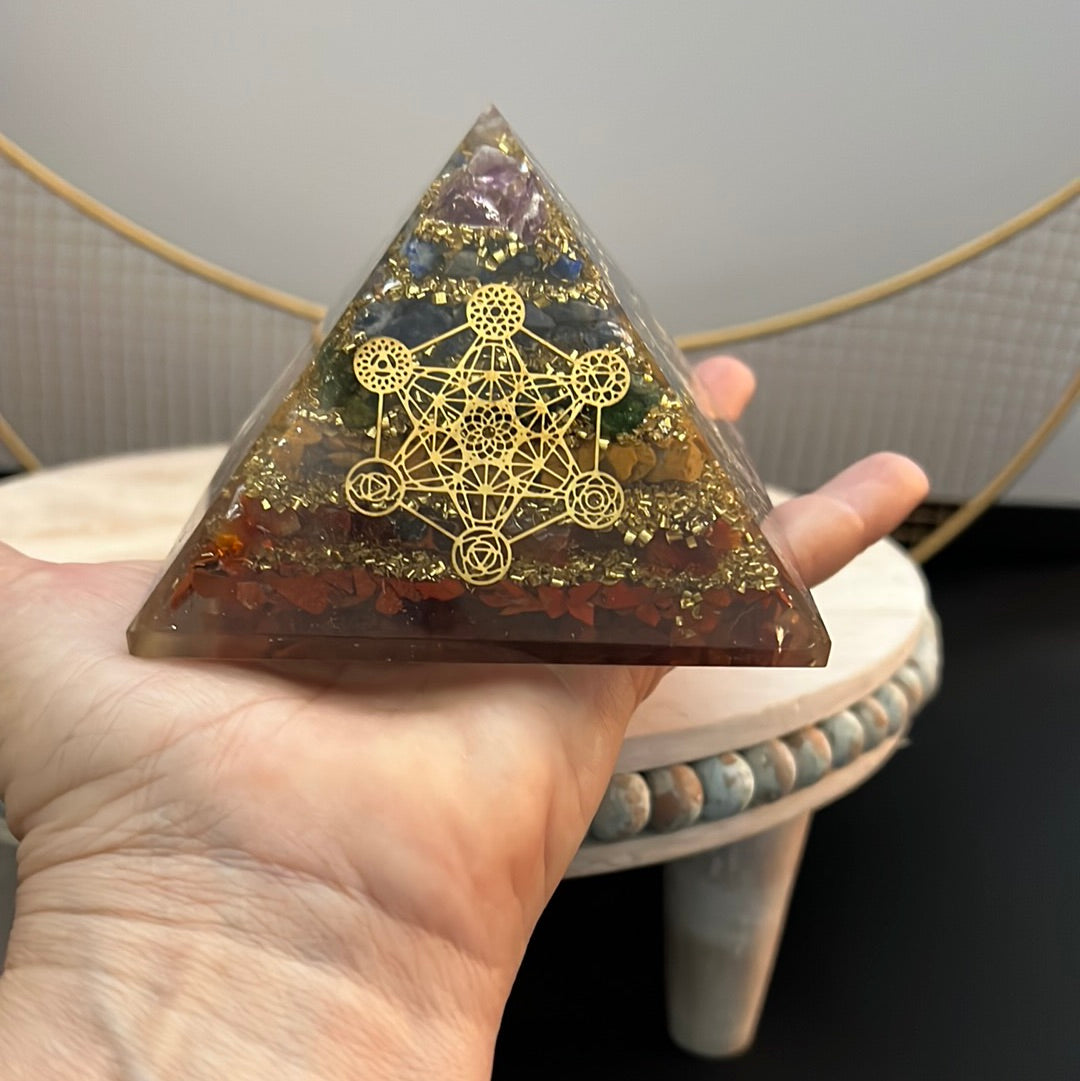 This beautiful pyramid which focuses energy is 3 1/2“ x 3 1/2“. The shavings are brass and so there is a golden layer between each of the chakra colors. Use this pyramid for your altar, to ward off EMF’s, and to enhance your energy practice. Place on your body on top of a chakra and feel the energies shift.