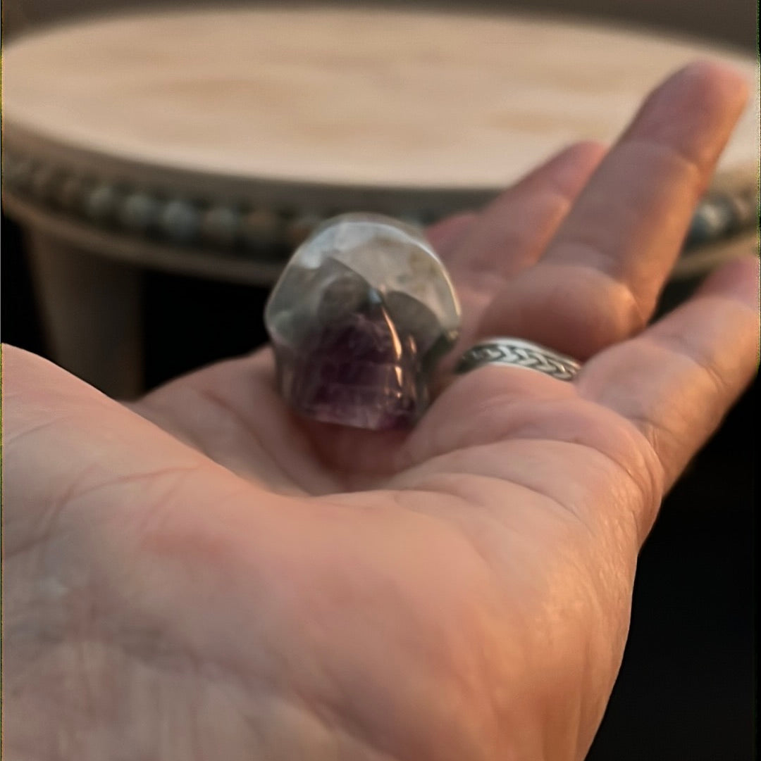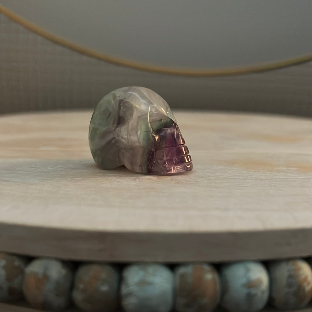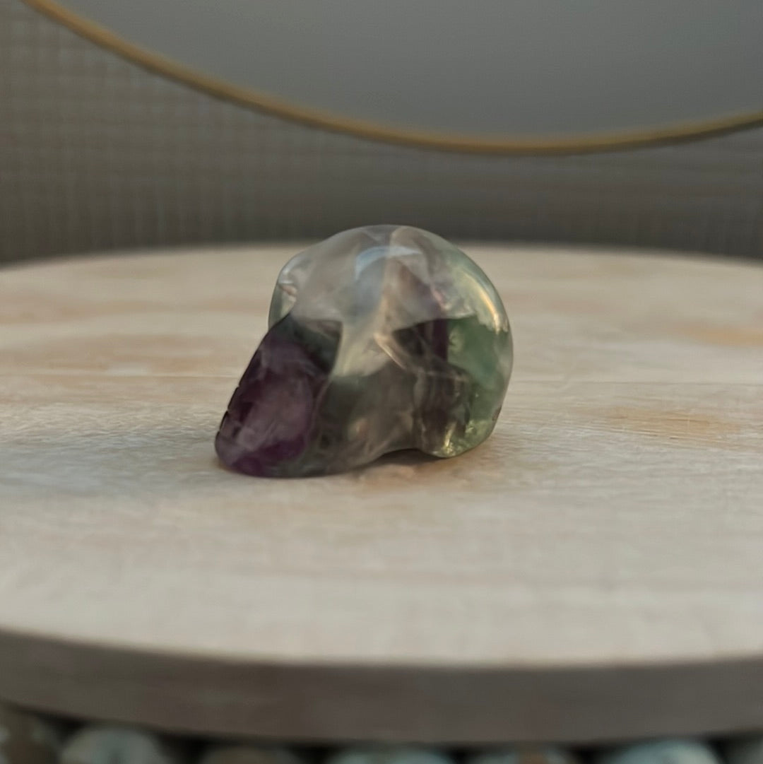 This mini skull is a beautiful specimen of fluorite with a mix of clear and teal and purple with some beautiful striations. Fluorite is a stone of psychic development, abundance, and creative openings.